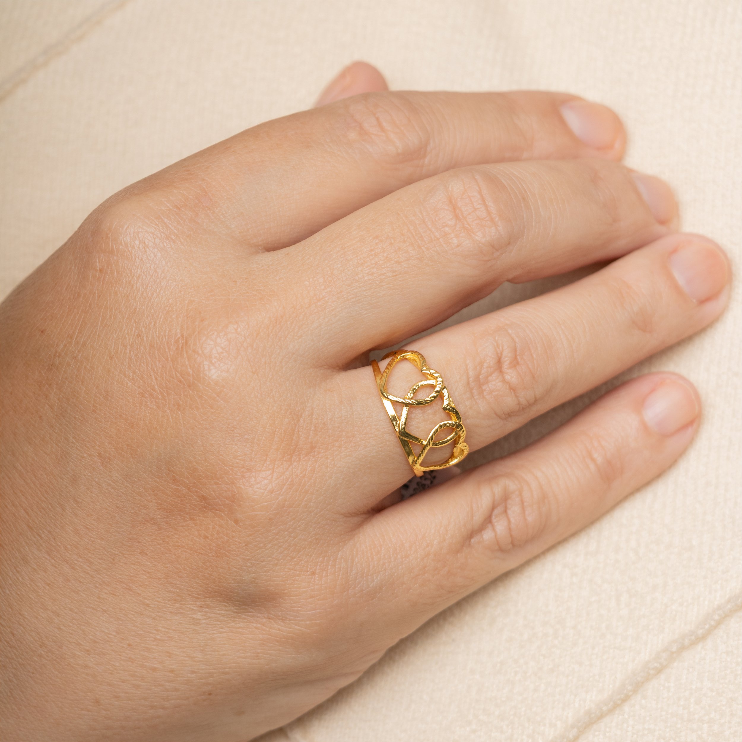 Delicado e romântico, este anel dourado com corações entrelaçados é a escolha perfeita para quem busca elegância e significado em uma única peça. O design vazado, com acabamento polido e leve brilho, simboliza a união e o amor eterno — ideal para presentear alguém especial ou compor seu look do dia a dia com um toque de sofisticação.