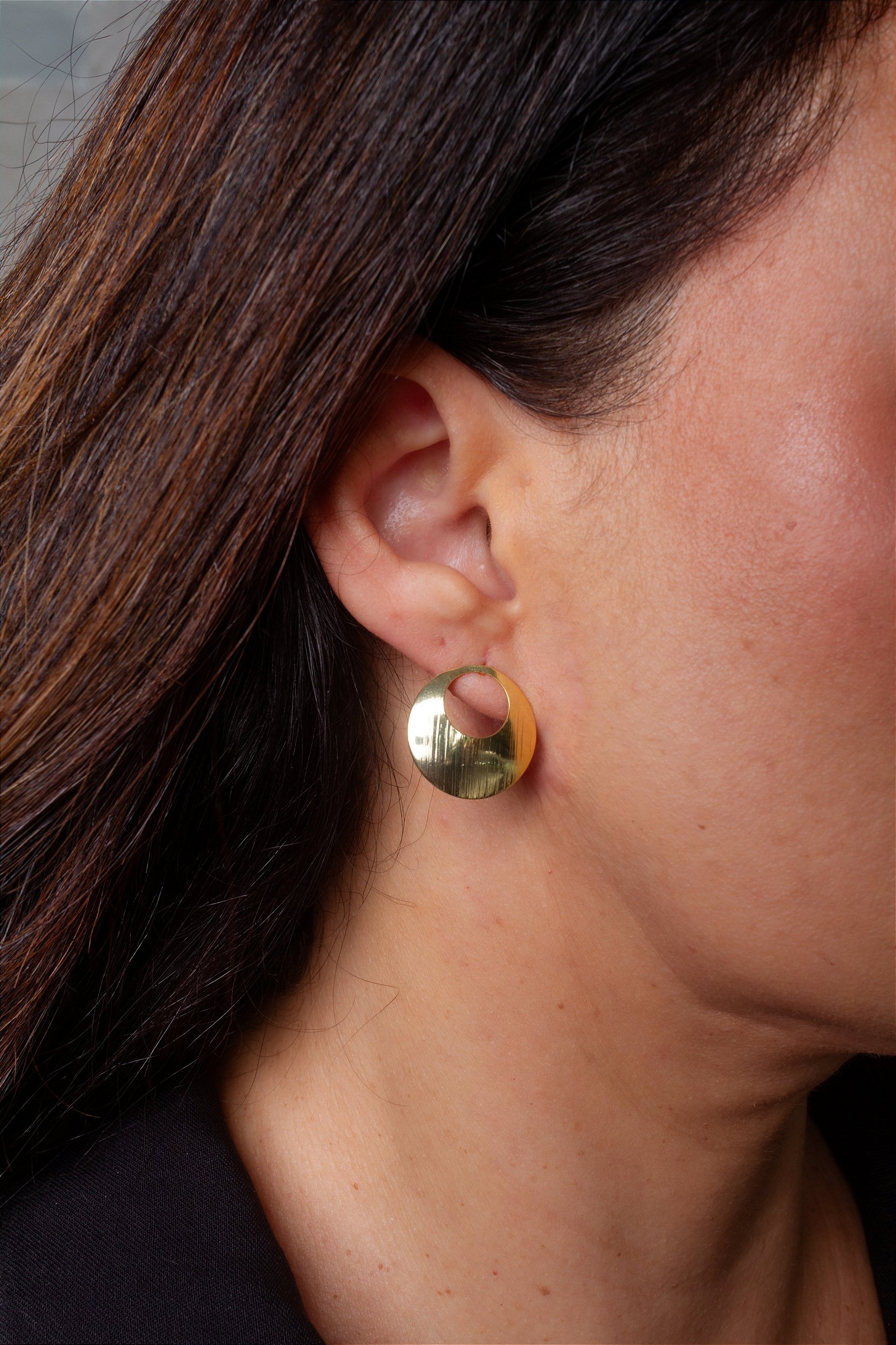 Disponível nos Banhos Ouro 18k e Ródio Branco a superfície levemente texturizada em acabamento polido reflete a luz de maneira sutil, valorizando o brilho do metal sem excesso. O formato em disco com bordas suaves traz presença ao lóbulo, mantendo uma estética limpa e sofisticada.