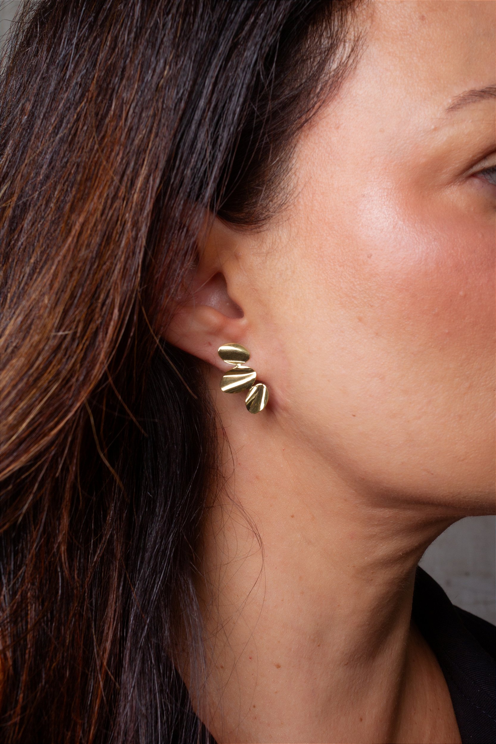 O Brinco Vértice apresenta um design contemporâneo inspirado em formas naturais e assimétricas. Composto por três elementos ovais levemente irregulares, a peça cria um visual dinâmico que valoriza o movimento e a composição no lóbulo.