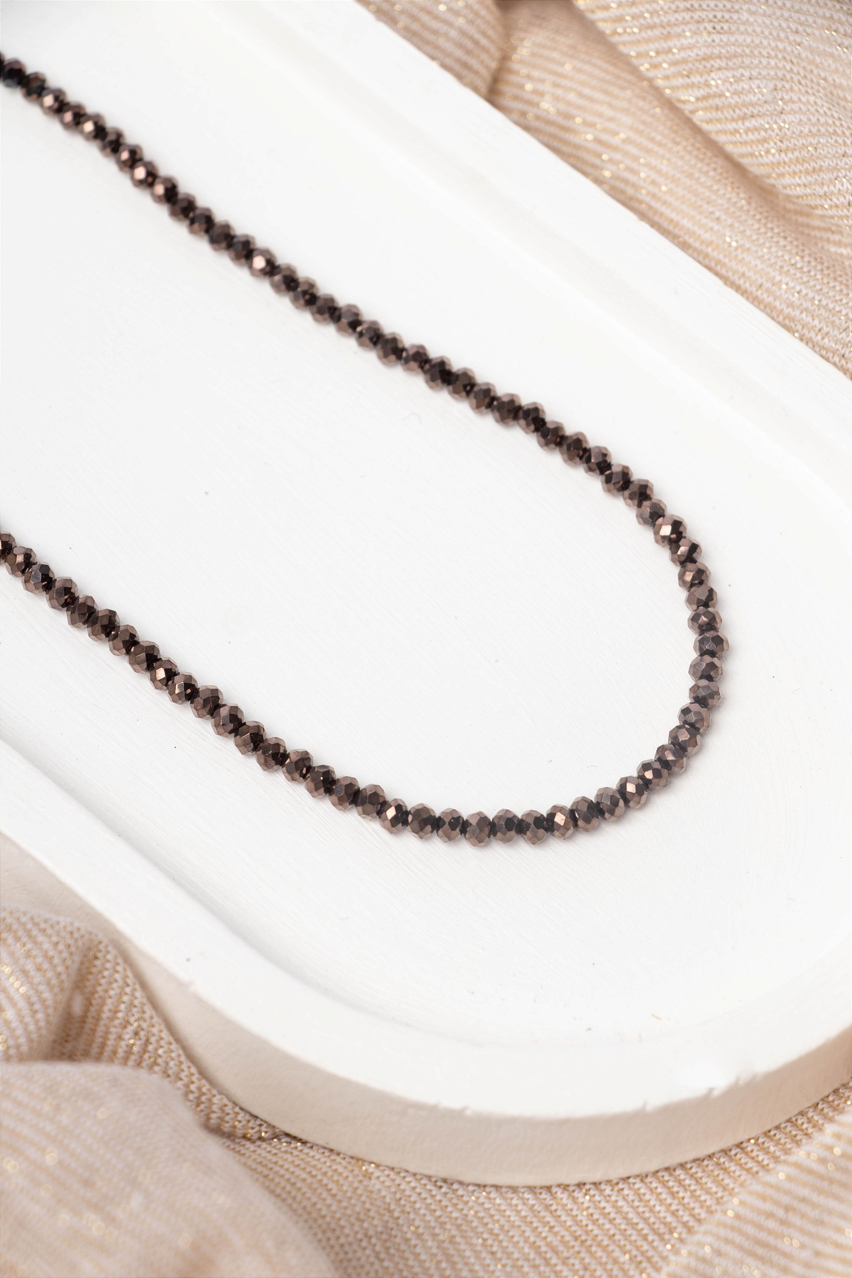 Formado por pequenos cristais facetados em tom terroso, o colar reflete a luz de forma elegante,
