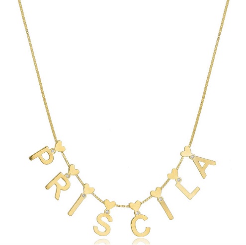 O colar com nome apresenta um design personalizado com abordagem delicada e bem distribuída ao longo da corrente. As letras posicionadas de maneira levemente curvada, acompanhando o contorno do colo e criando um efeito visual fluido e equilibrado.