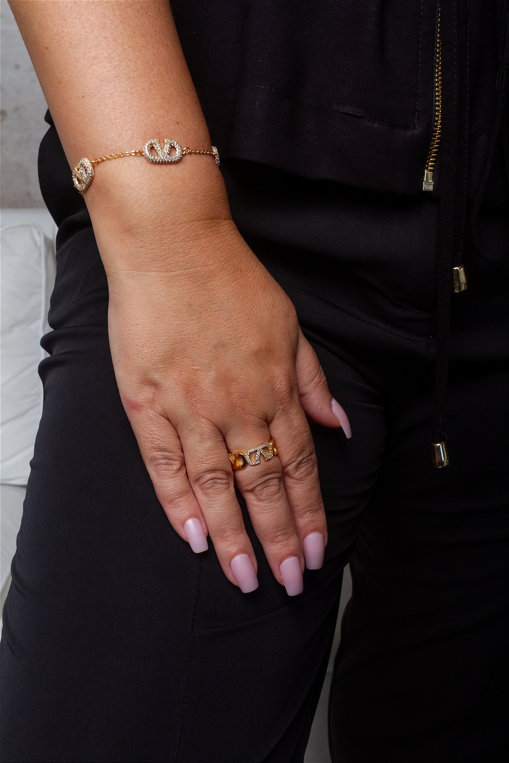 A Pulseira VALENTIN apresenta um design moderno com composição em corrente fina, intercalada por elementos centrais em formato de elos estilizados. Esses elementos se destacam pelo contorno arredondado e pela superfície totalmente cravejada, criando um ponto de brilho contínuo ao longo da peça.